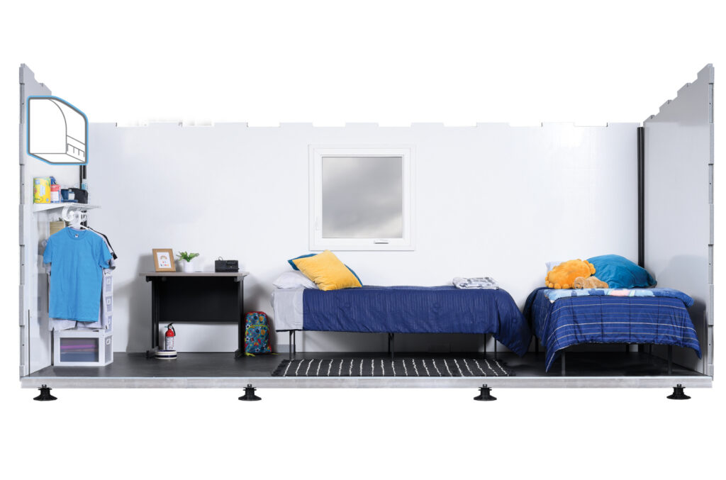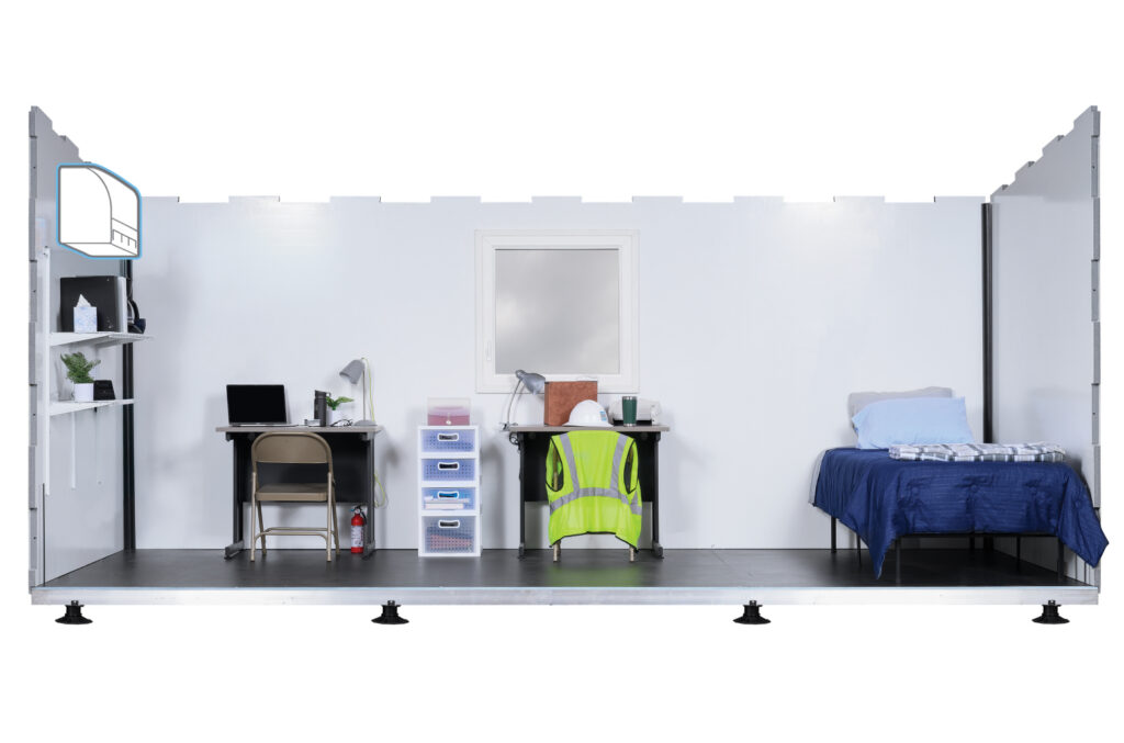 Residential windows, locking doors, smooth interior walls, easily accessed interior lighting, and climate control offer comfort and privacy. Interior storage and space allows residents to keep possessions and pets, while the customizable shelving system and freestanding bed and desk are designed for simple modification – making each shelter a personalized space to recharge.
