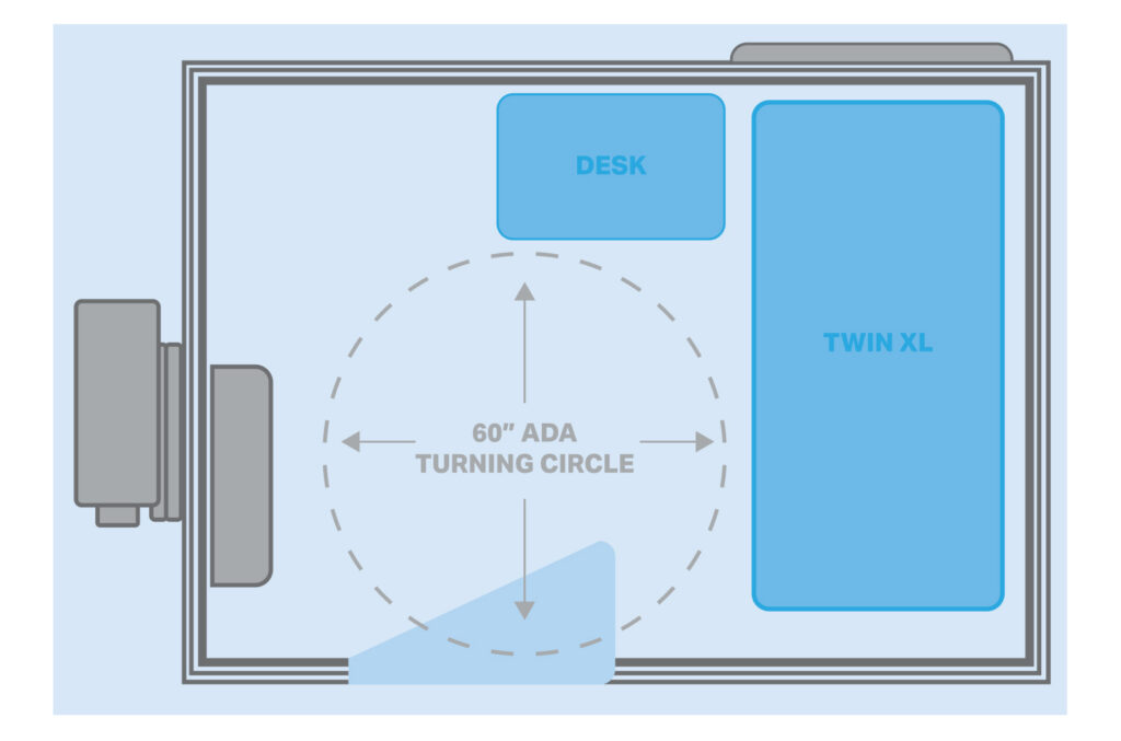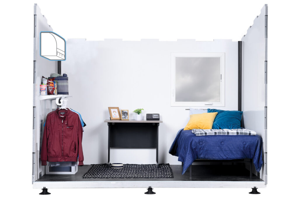 Residential windows, locking doors, smooth interior walls, easily accessed interior lighting, and climate control offer comfort and privacy. Interior storage and space allows residents to keep possessions and pets, while the customizable shelving system and freestanding bed and desk are designed for simple modification – making each shelter a personalized space to recharge.